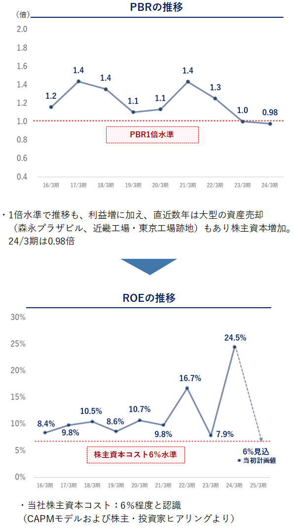 PBR1倍水準、ROE8%以上で推移も、直近は大規模な資産売却影響等により株主資本が増加、ROE低下要因となり、早期に8%以上へ回復することが重要と認識
