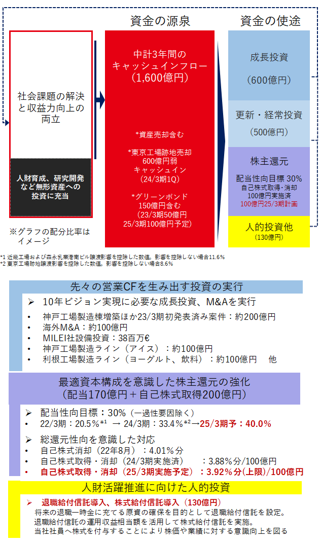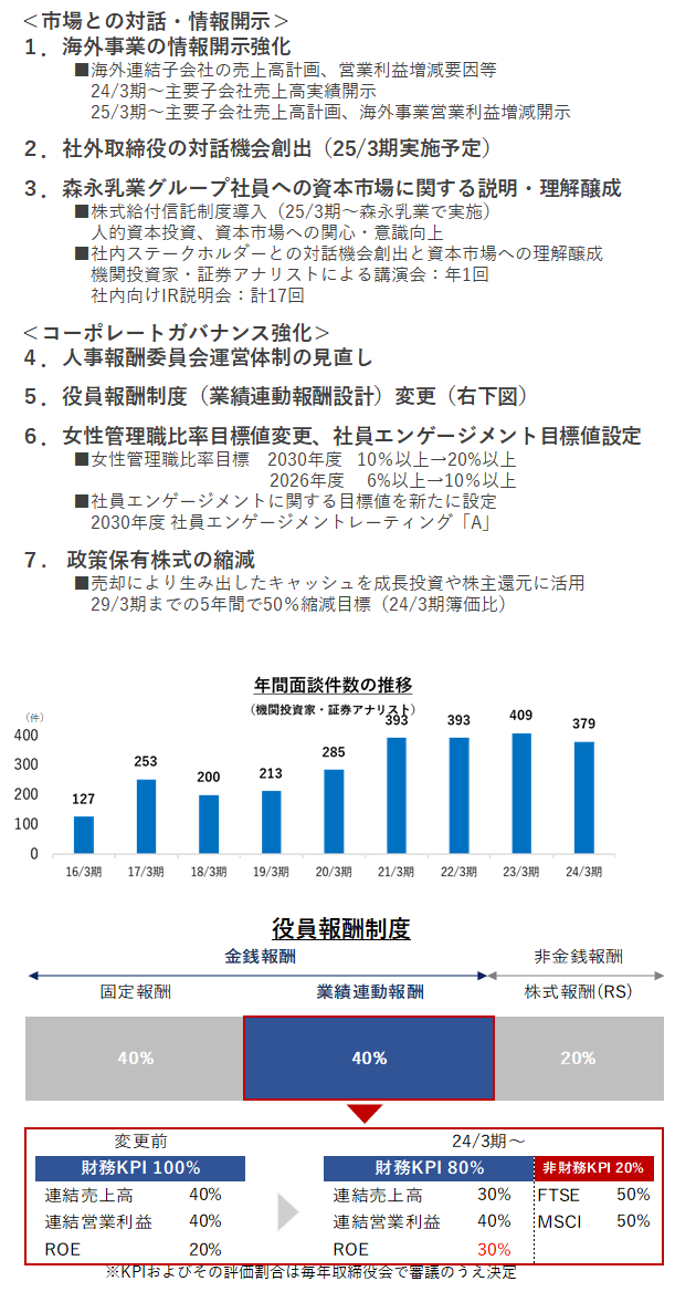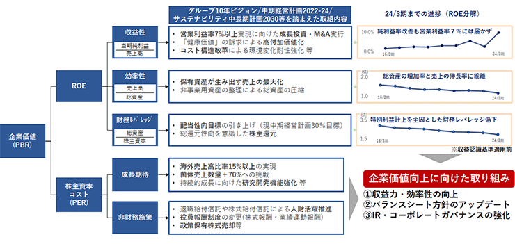 当社は「森永乳業グループ10年ビジョン」「中期経営計画2022-24」「サステナビリティ中長期計画2030」等に沿って、ROEやPER向上への取り組みを進めております。ステークホルダーの期待に応え、持続的な成長とさらなる企業価値向上に向けて「収益力・効率性の向上」「バランスシート方針のアップデート」「IR・コーポレートガバナンスの強化」の3点に取り組んでまいります。