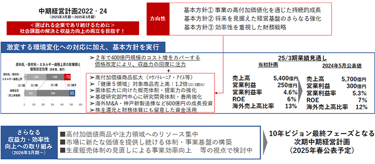 激変する環境下、価格改定の遂行で収益力の回復に注力。10年ビジョンにおける現中計の位置づけや方向性に変化はなく、方針に合致した取り組みを着実に実行(次期中期経営計画は2025年春公表予定)