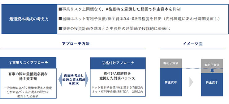 スライド中の2つのアプローチ(事業リスクアプローチ、格付けアプローチ)の考慮や、将来の投資計画も踏まえ、段階的に株主資本の割合を圧縮し、資本構成の最適化を進めていきます。