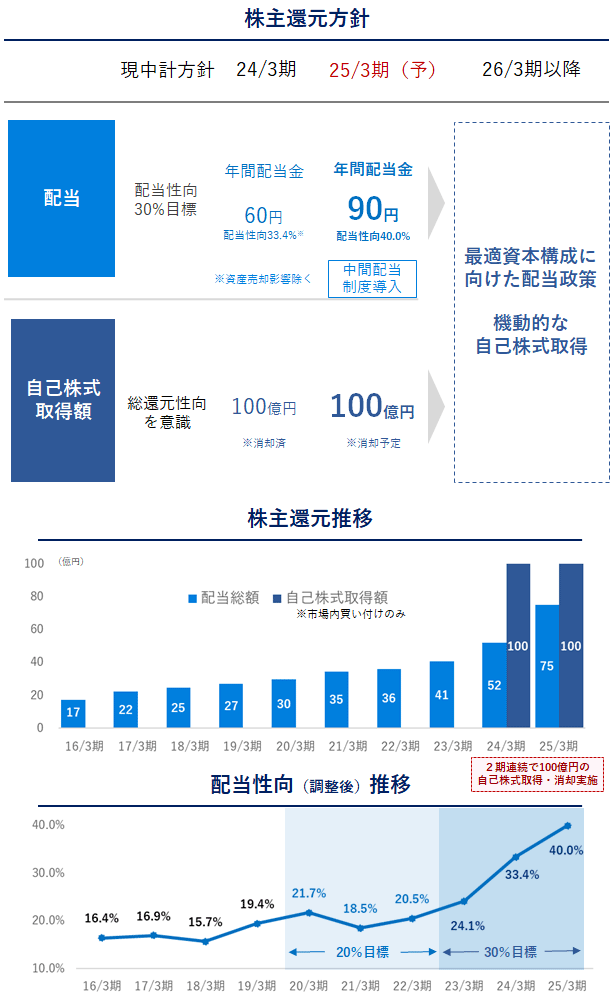 その結果、25/3期の一株当たり年間配当金は前期60円から90円へと増額する計画です。期初予想に対する配当性向は40%となります。なお、当社はこれまで期末配当のみでしたが、25/3期より中間配当制度の導入を予定しています。また、前期に続き25/3期も最大100億円の自己株式取得・消却を実施することを決定しました。